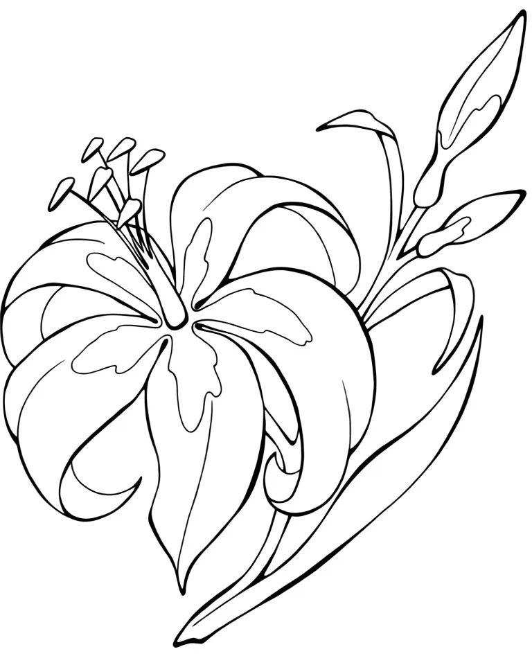 Раскраска «Цветущая лилия» Распечатать На пол-листа СкачатьВсе раскраски ЛилияСмотрите такжеПодсолнухРозаРомашкиТюльпаны